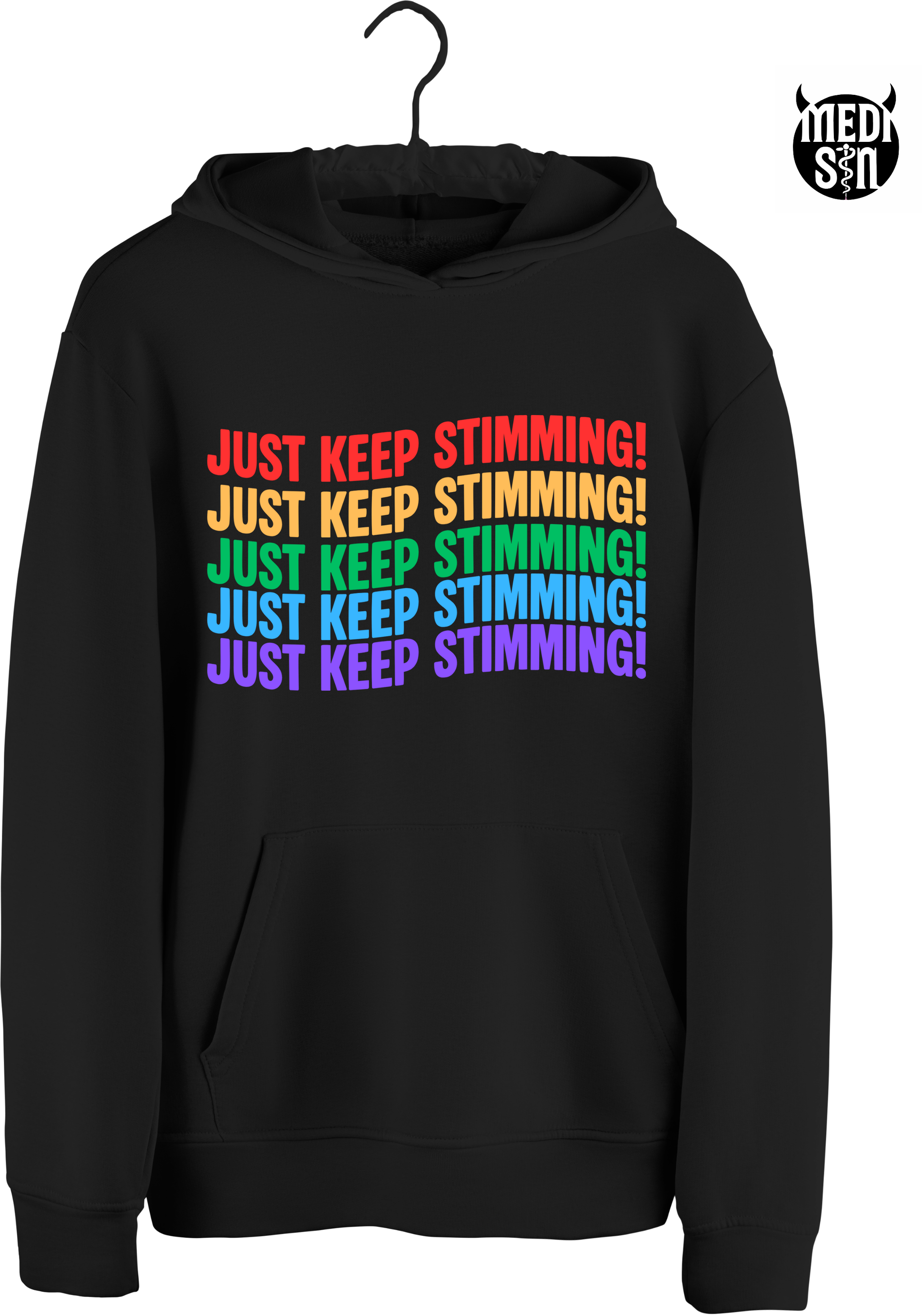 Celebrate self-expression and neurodiversity with our "Just Keep Stimming" Rainbow Hoodie. Designed for comfort and inclusivity, this black unisex hoodie features bold, vibrant rainbow text that repeats the empowering phrase JUST KEEP STIMMING! across the front. It’s a cozy way to showcase pride, individuality, and support for the autistic and neurodivergent community.