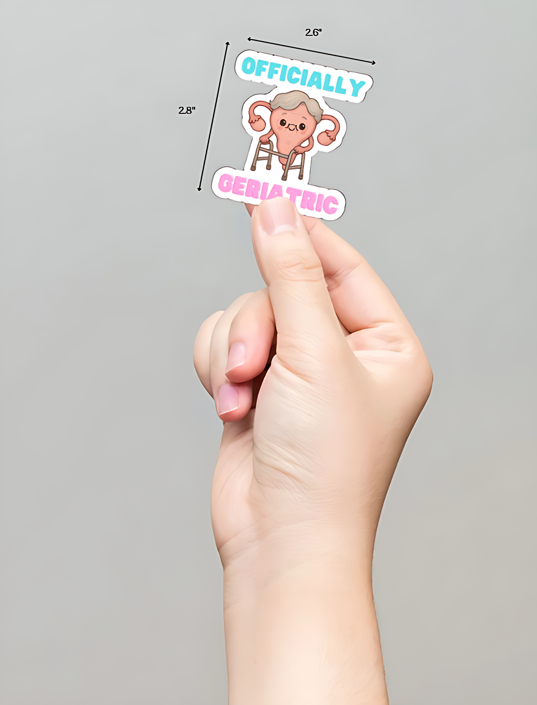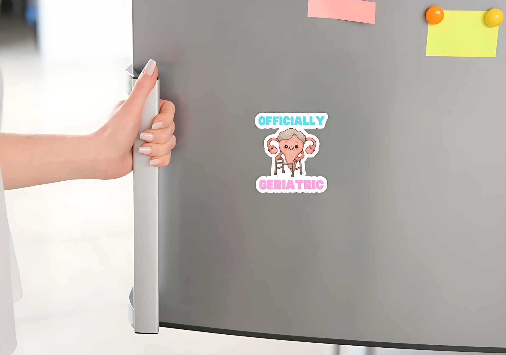 Featuring a cute cartoon character sitting in a chair with bold text that reads Officially Geriatric, this magnet is guaranteed to get a smile every time someone opens the fridge or locker.