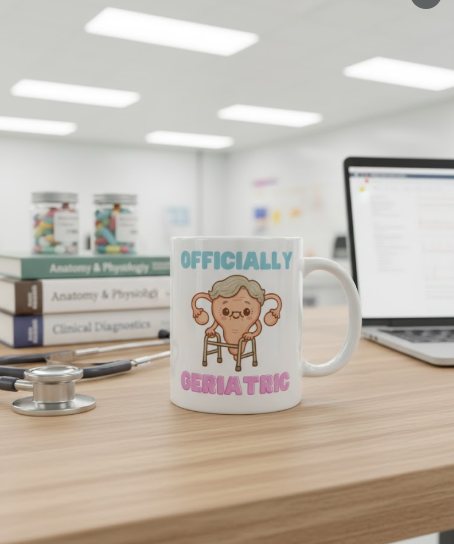 For anyone embracing the wisdom (and minor aches) of aging—or anyone working in OB/GYN or Geriatrics who appreciates a deep-cut joke—this mug is perfect. This 11oz or 15oz ceramic cup features an adorable, yet weary, uterus mascot using a walker, proudly declaring, "OFFICIALLY GERIATRIC."