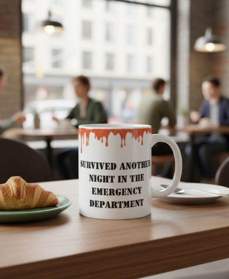 The Emergency Department is a battleground, and this 11oz or 15oz ceramic mug is the trophy you earned for surviving the shift! Featuring the bold, impactful text "SURVIVED ANOTHER NIGHT IN THE EMERGENCY DEPARTMENT" crowned with a realistic, high-gloss blood splatter design, this mug is the ultimate badge of honor.